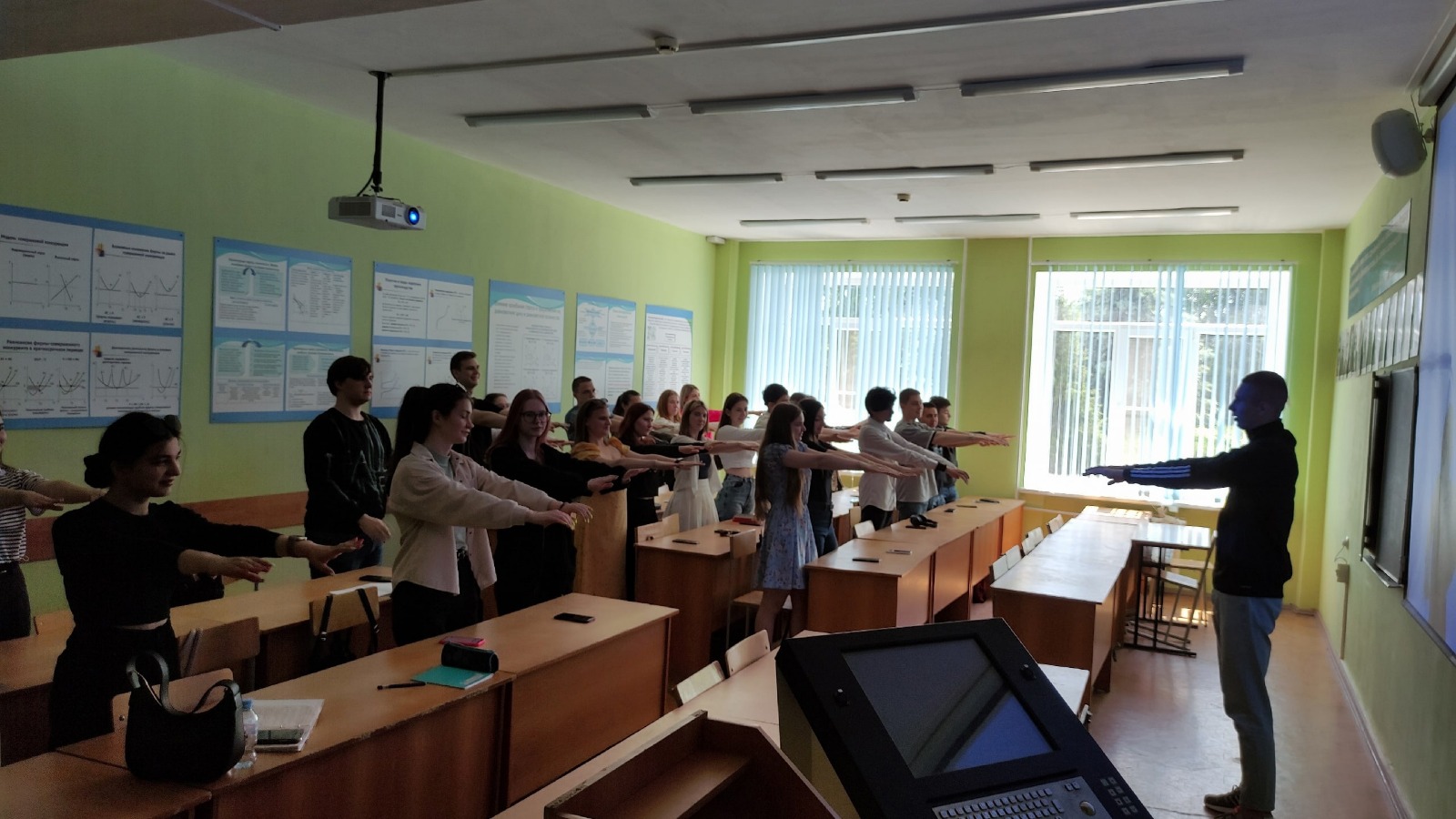 Студент 1 курса Илья Калинин не только рассказал слушателям об основах здорового образа жизни, но и сама лично показал упражнения для поддержания прекрасной физической формы и хорошего самочувствия. Студенты и преподаватели с неподдельным интересом повторяли оздоровительные приёмы.