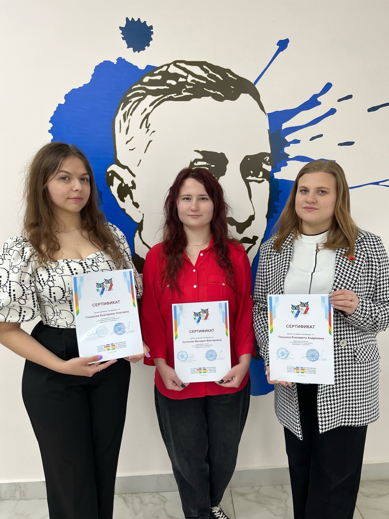 Студентки 3 курса, представители студенческого научного общества института ЭУиСТ: Першина Елизавета, Говорова Екатерина и Куликова Валерия под руководством Юлии Леонидовны Есиной приняли участие в юбилейной XV Всероссийской студенческой олимпиаде по статистике, проводимой Федеральной службой государственной статистики и Российским экономическим университетом имени Г.В. Плеханова. В ней приняли участие 107 вузов из 60 регионов России.